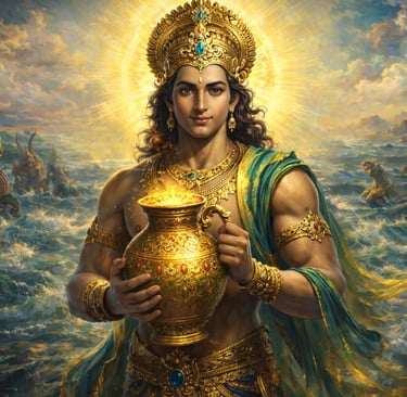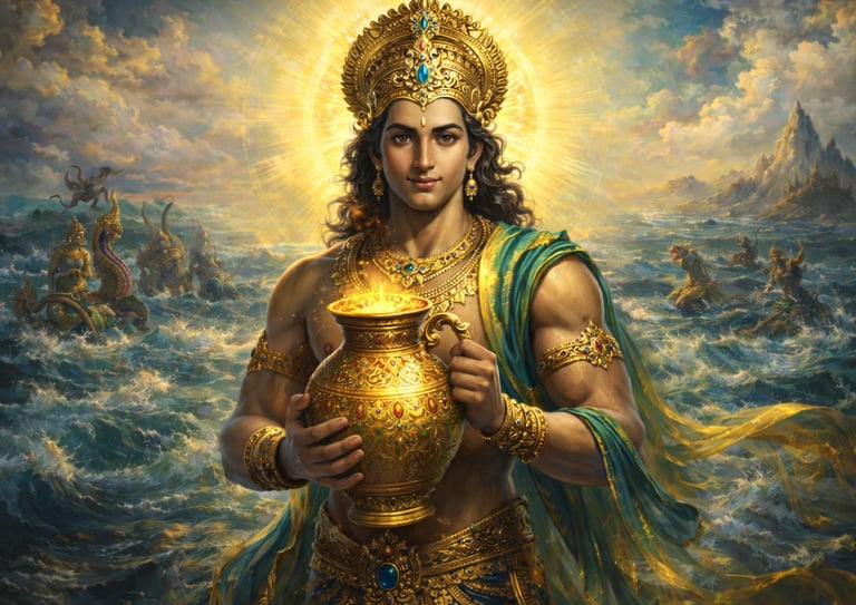 “Still churning the Ocean of Milk with great fury—Lord Vishnu—in His form of Lord Dhanvantrari suddenly appeared. Dhanvantrari was very strong, young, and handsome and in His hands He carried a large jug filled to the top with the nectar of eternal life. However, even though He was excellent in so many ways, by the will of Providence the demons were able to steal the jug.