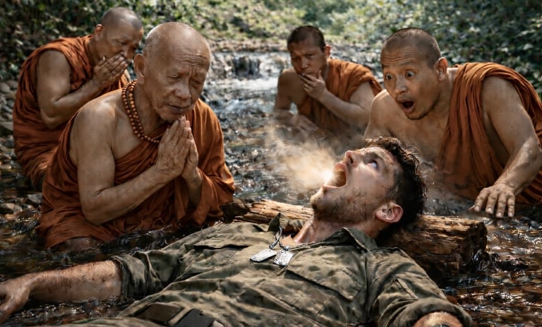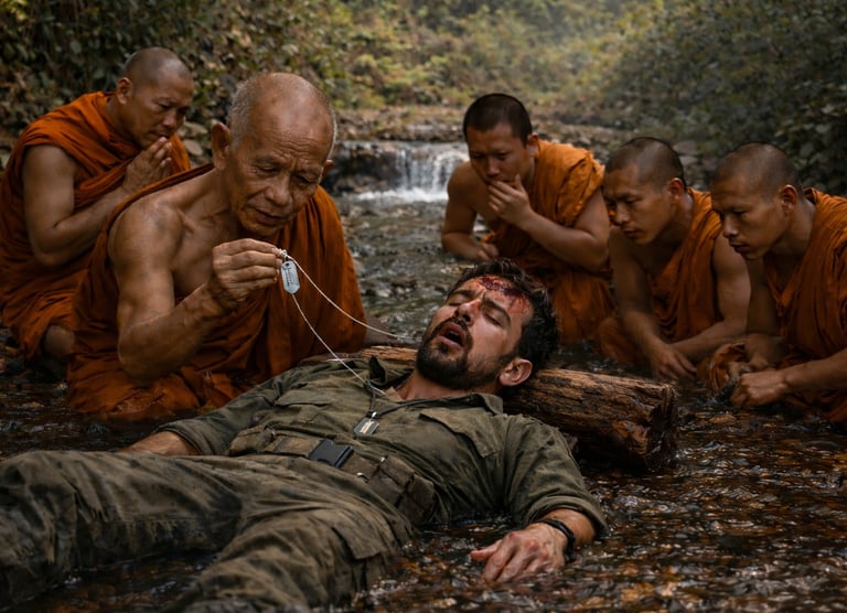 For many good reasons America was looking for its dead but for Jimmy Sutton this mission was even more painful. Not just because he had fought here, but for other reasons. More secret reasons. Interrupted in thought by the sounds of the men up ahead he would have to come to grips with his feelings later. Now a swift stream brought the man with the machete to a standstill. All twenty men stood watching and wondering how they would get to the other side. Lt. Ngo assured everyone that they would find a way.