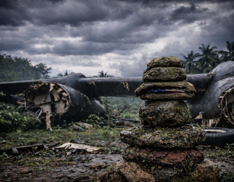 It was then on the left side of the fuselage, near the cliff, that Blake spotted the mysterious object. Oddly, the pile of rocks looked familiar, but not something that he was expecting to see on the jungle floor. Not here. It caught him by surprise.