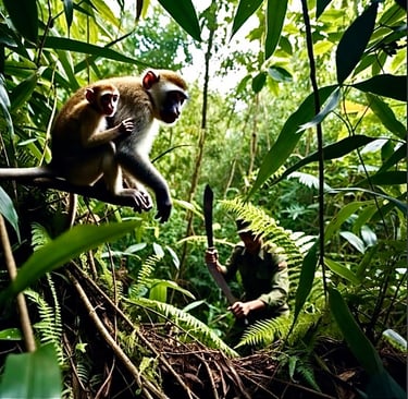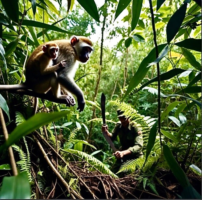 High from her tree-top lookout the monkey was the first to notice the noise. Her baby clung even closer to her. Elsewhere, other monkeys moved nervously as they, too, peered through the jungle canopy.
