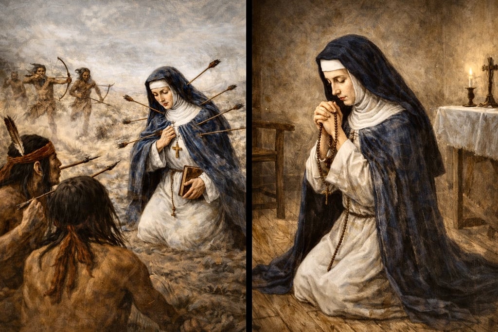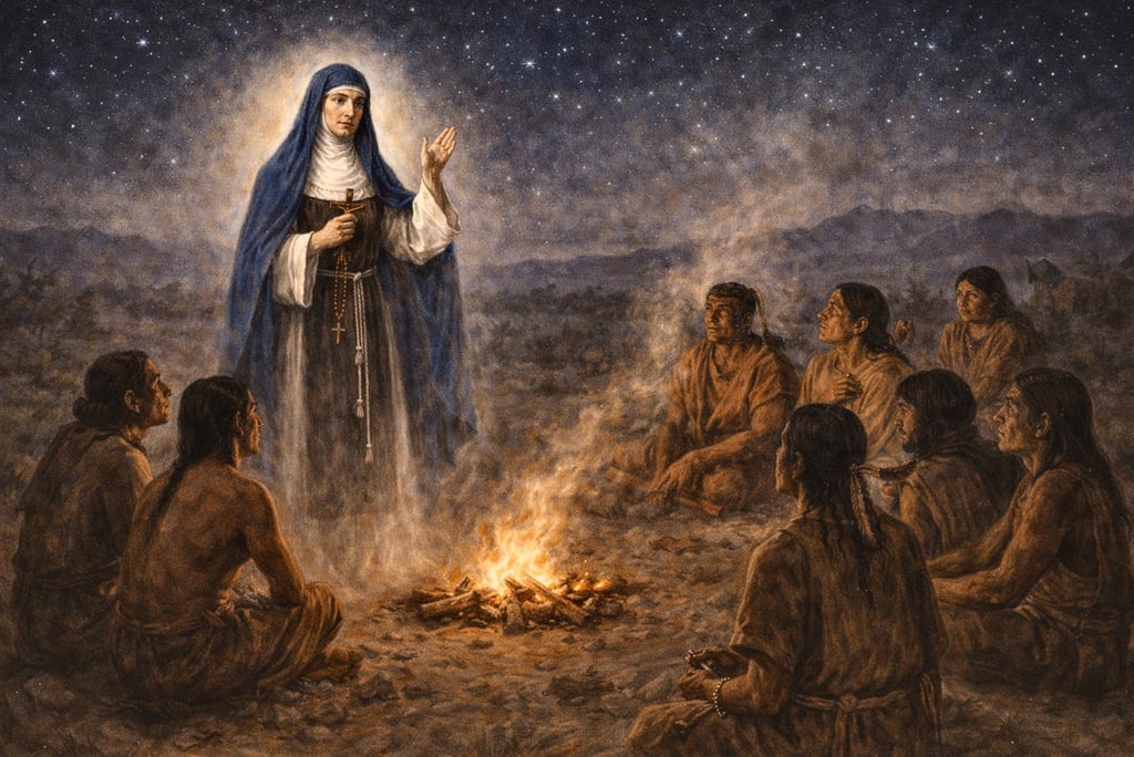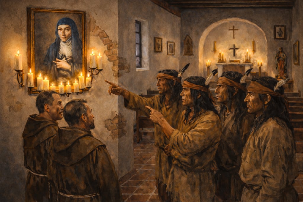 “Asked why, the Indians said that the woman who taught them was dressed exactly like her. However, instead of the old nun in the painting, their teacher was a young woman and very much alive.”