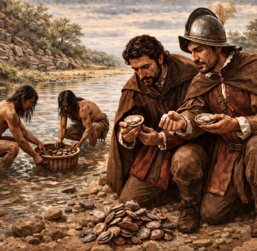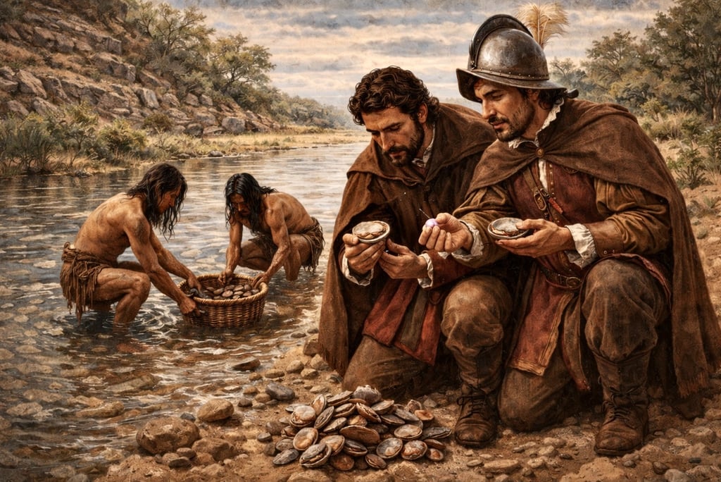 Regarding Martin and Castillo, their interest were rather unique and strictly focused on the freshwater mussel shells of the Rio Concho river, and the pink pearls that can be pried out of them. These two men were in San Angelo strictly for the money. In fact, Concho pearls from this era can still be found in the possession of Spanish royalty back in Spain. Even today, as the author discovered, if you take a walk along Main Street, inside the Legend Jewelry Store you can still buy a pair of pearl earrings, harvested from the same freshwater mussels that were discovered in San Angelo over 350 years ago.