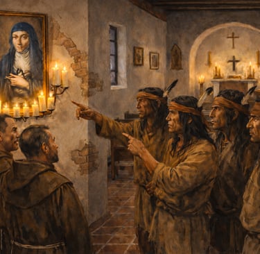 “When word reached Mexico City, and then Madrid, that large numbers of Indians were asking to be baptized, an investigation was organized. In Spain, the inquiry was led by the Franciscan Minister General, and in New Mexico by Archbishop Manzo and the priests, Padre Perea and Padre Alonso Benavides. They all asked the same questions: ‘How could Indians from a remote and distant area that priests had never set foot in, be seeking them out?’